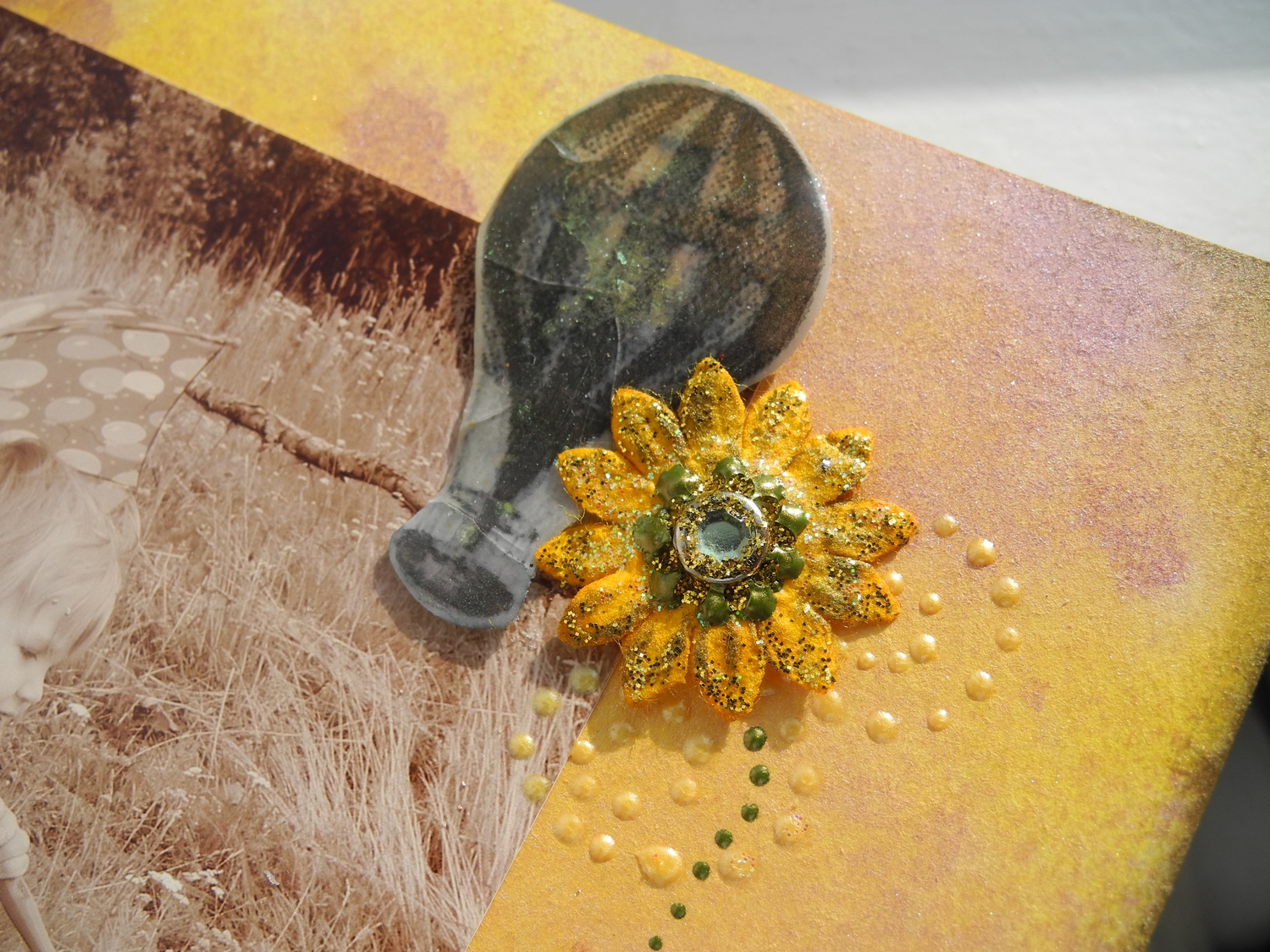 Kwiatek - na dole zrobiony jest z najbrzydszych sztucznych kwiatków jakie widziałam, pomalowałam na żółto, dodałam błysk perfect pearls, wygrzałam "na grubo" przeźroczystym pudrem i na koniec pokryłam złotym pudrem, dałam ćwieka i brokat. Także jak na takie paskudztwo wyszedł ciekawie.